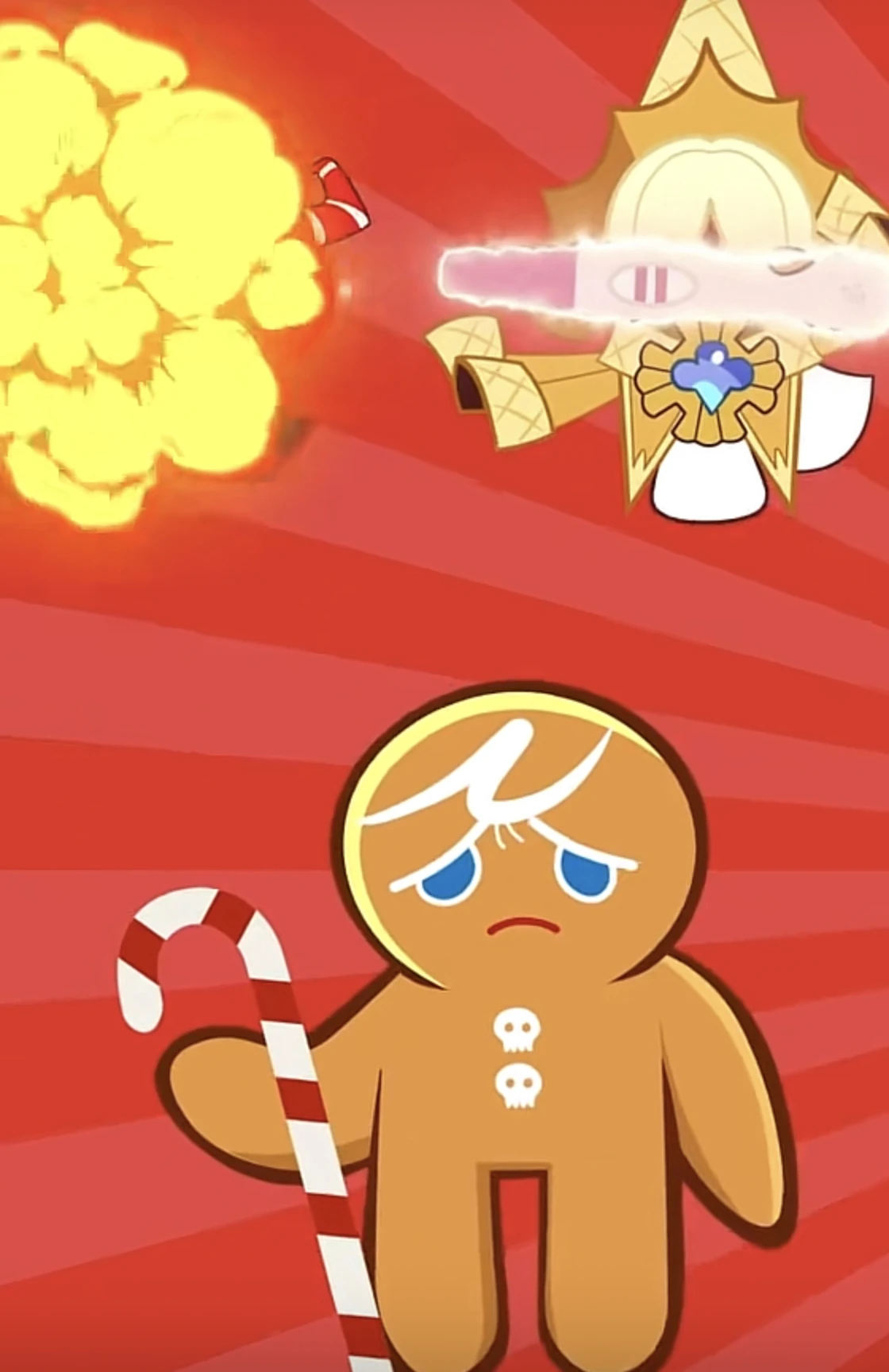 It starts with a sad GingerBrave, and Dark Enchantress Cookie appears from nowhere and says "Never". Pure Vanilla Cookie also appears from nowhere wielding the "Femometer" instead of a flower, which zaps GingerBrave and also kills Dark Enchantress Cookie.